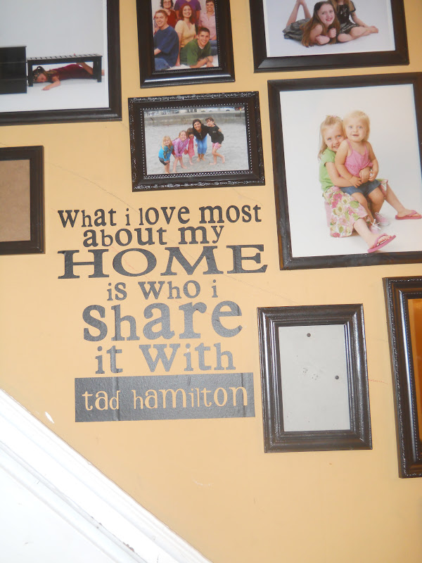 I bought almost all of the frames at the dollar store and spray painted them all the same color (some were old frames I had laying around the house). I used Command picture hangers to attach them to the wall (this makes them easier to reposition and change out pictures).  I cut the quotes out using my Cricut and black vinyl.  Some of the frames are still empty and almost all of the pictures are of my girls but I hope to replace them with family photos soon.  I already have my mom finding some good ones for me.